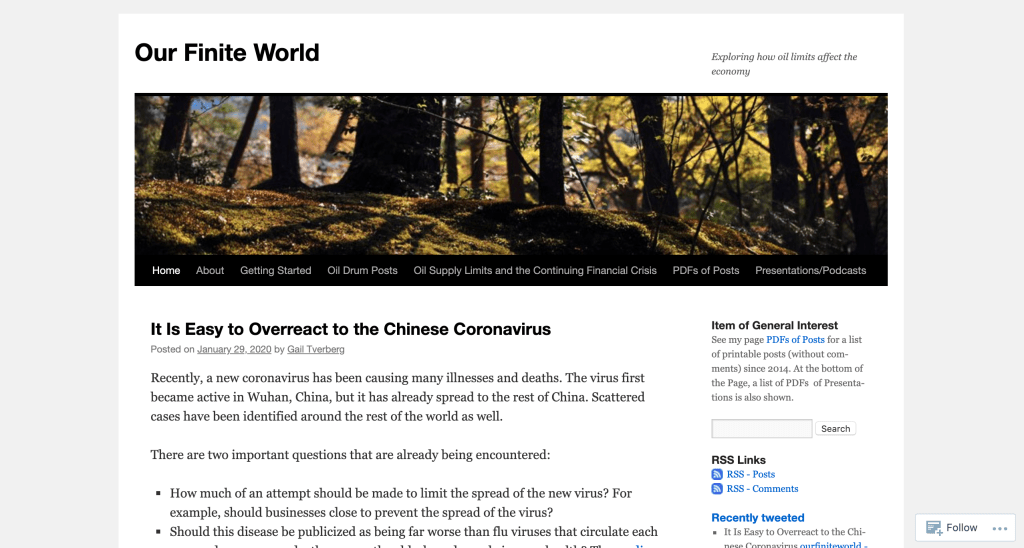 Both blogs surround the topic of energy resources and alternatives. Our Finite World “explores” the intersection between fossil fuel production and global economics. Its posts’ titles range from Do the World’s Energy Policies Make Sense? to How Renewable Energy Models Can Produce Misleading Indications and Scientific Models and Myths: What is the Difference?. The topics fit the stated purpose, by the author, Gail Tverberg. The language used in the titles also fit an educated audience. For example, the average individual would likely not search for information on “renewable energy models.” It is more intricate or complex than an uneducated or younger audience is typically searching for.