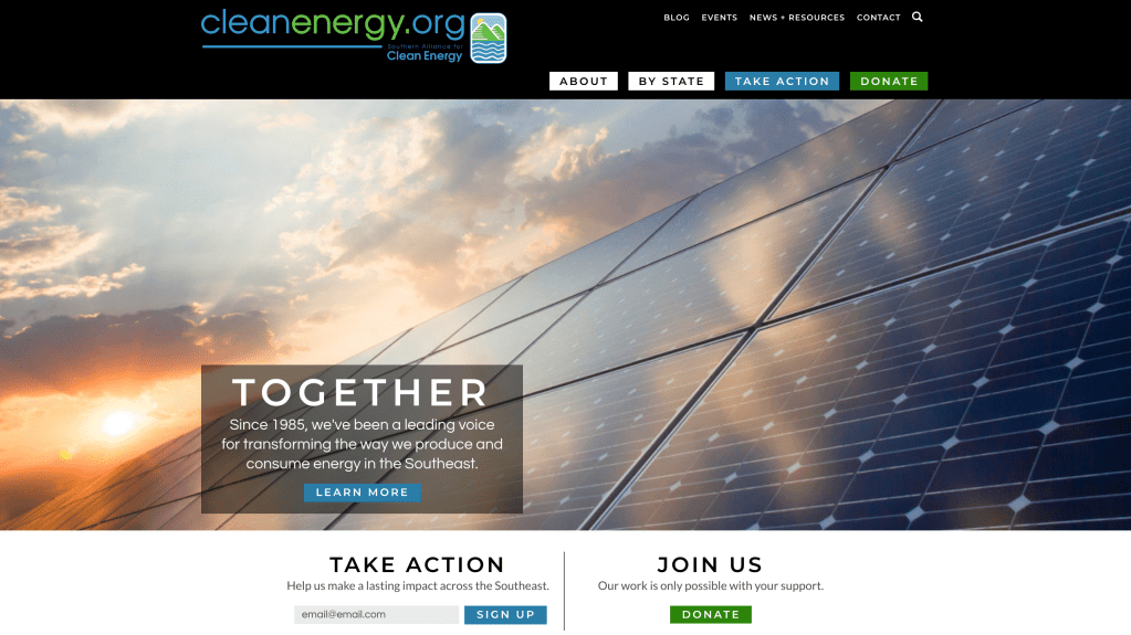 CleanEnergy.org also uses logos but heavily relies on pathos to evoke emotion in their call to action. Examples of this are seen below in a video they created. In the video, “We need your help!”, the title alone creates a sense of compassion and urgency in the viewer. Within the content, images of the “devastating impacts” to the “cherished coastlines” and the “majestic colors of the Blue Ridge Mountains” highlight the natural beauty of the Southeast in hopes of convincing the viewer to feel the same.